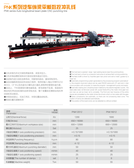 PNK系列汽車縱梁平板數(shù)控沖孔線:自動上料、沖孔、自動下料,全線自動運行。適用于汽車縱梁的全自動批量生產(chǎn)。加工范圍可跟據(jù)客戶需求進行定制。